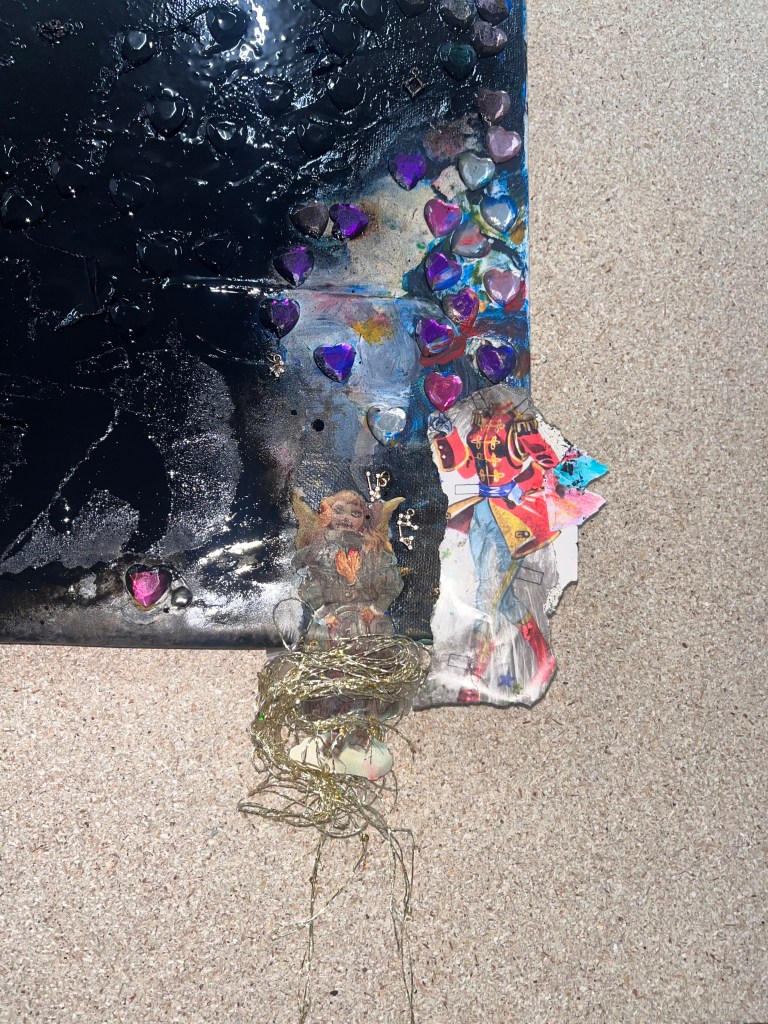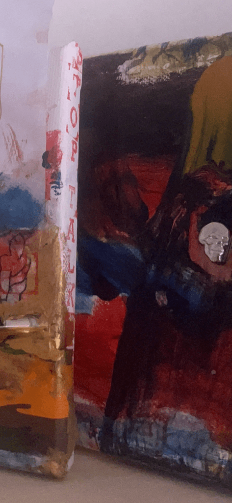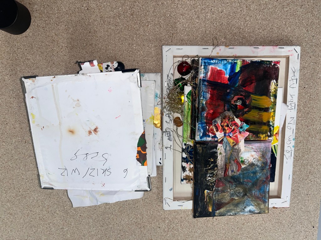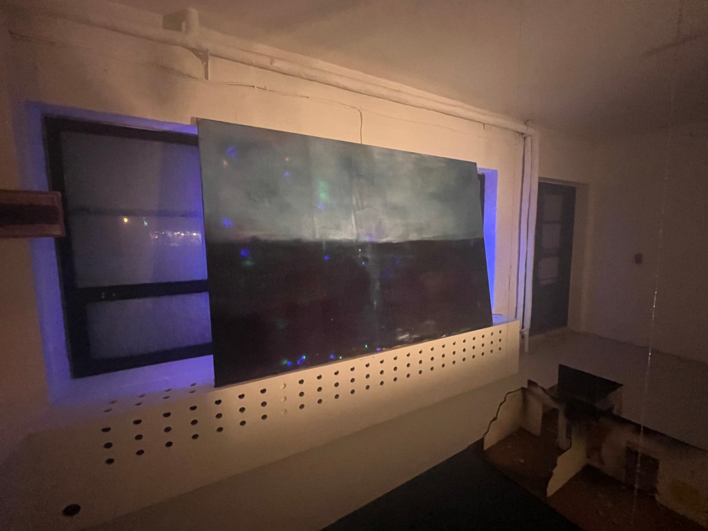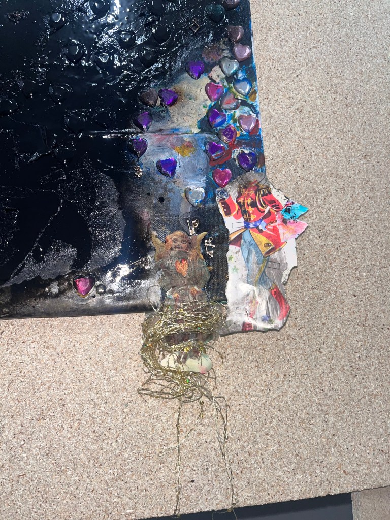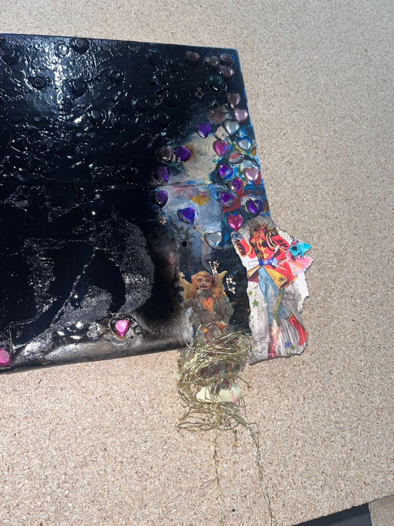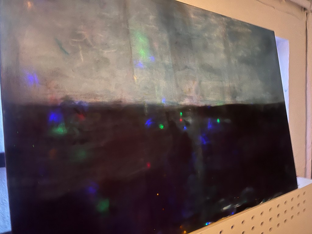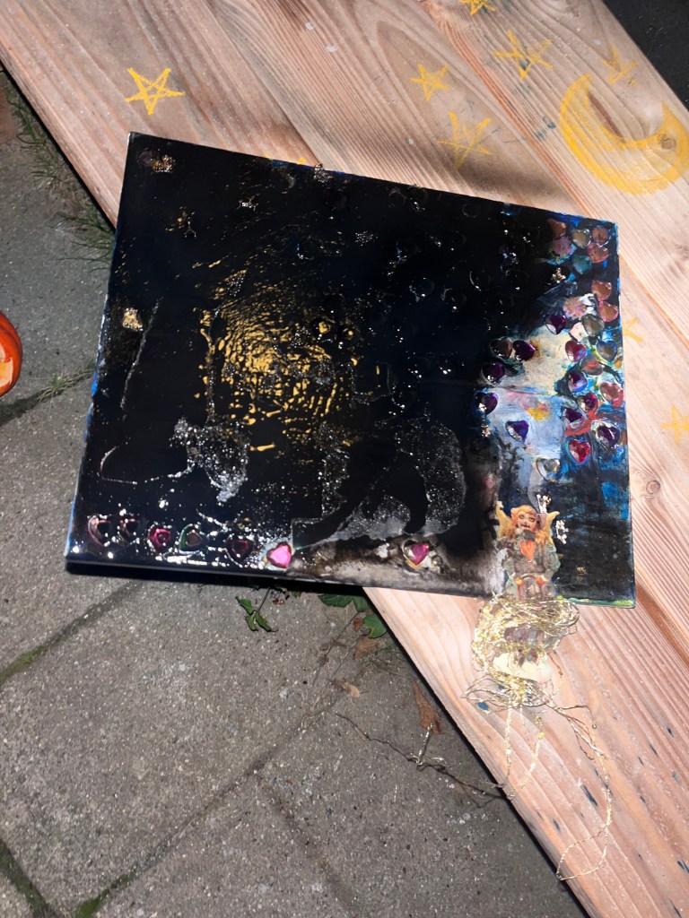 det store mdf korsbord der havde fået tonkin lak og benzin og ild og så det horisontale maleri som jo før var det der rasta flag det var med på den frie. som blev til glitter og monestarieblåt hav )og samtidig lakerede jeg simones gulv også med monestarieblåt pigment 🤪😭)