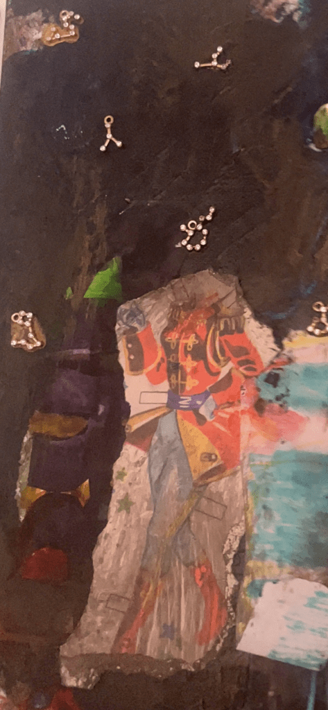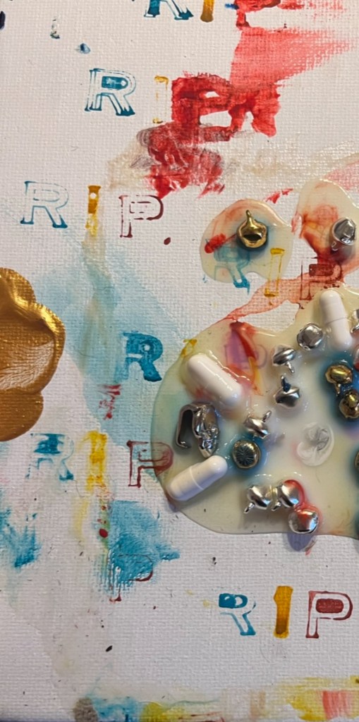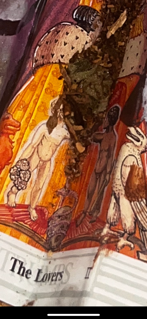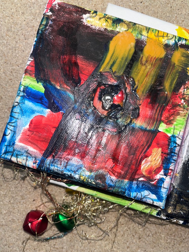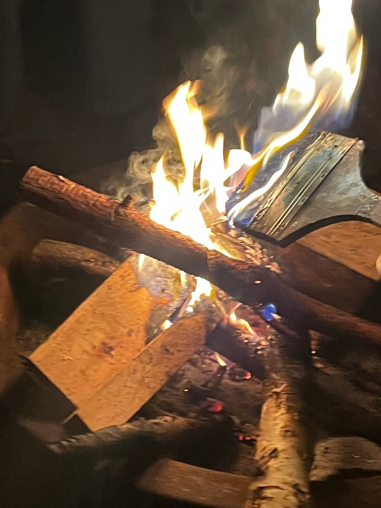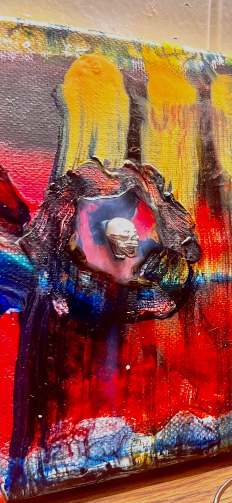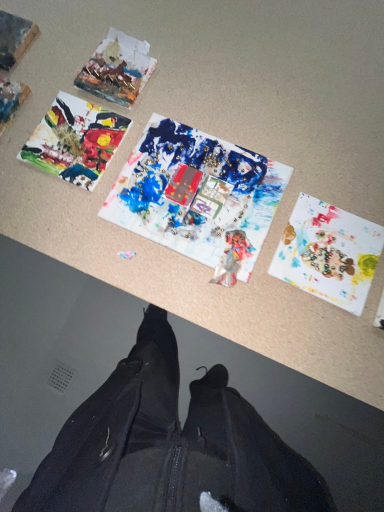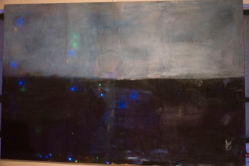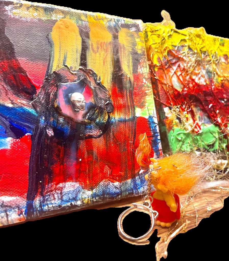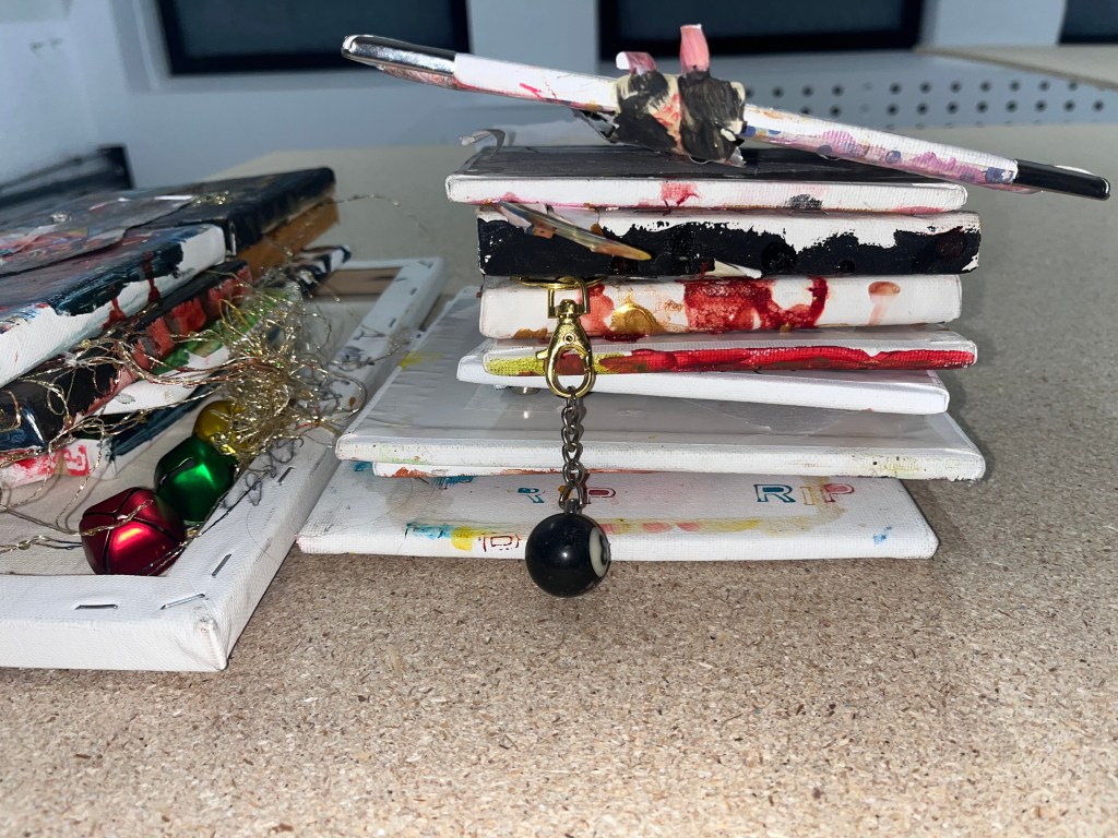 det store mdf korsbord der havde fået tonkin lak og benzin og ild og så det horisontale maleri som jo før var det der rasta flag det var med på den frie. som blev til glitter og monestarieblåt hav )og samtidig lakerede jeg simones gulv også med monestarieblåt pigment 🤪😭)