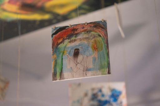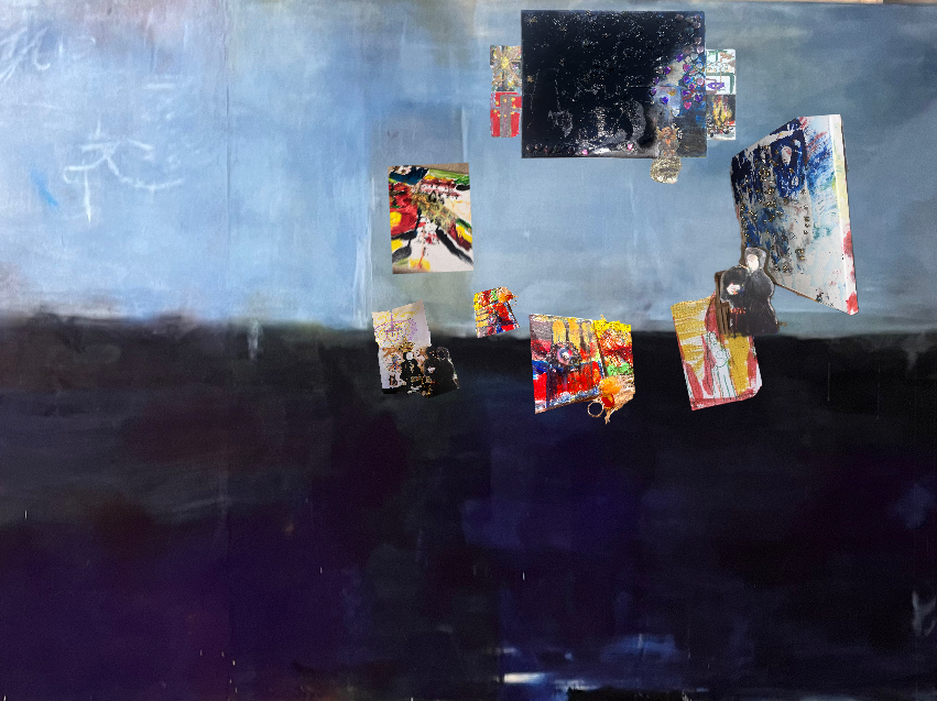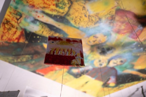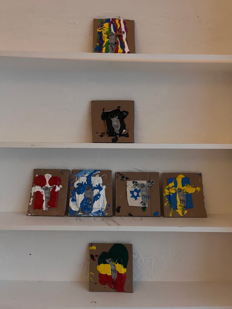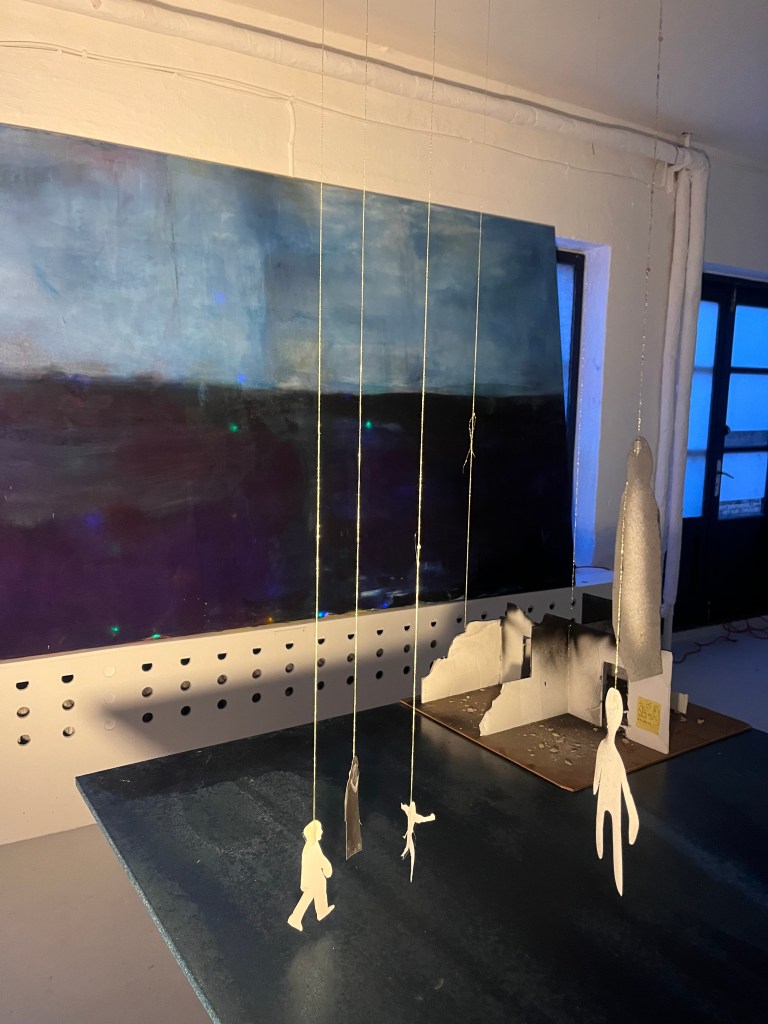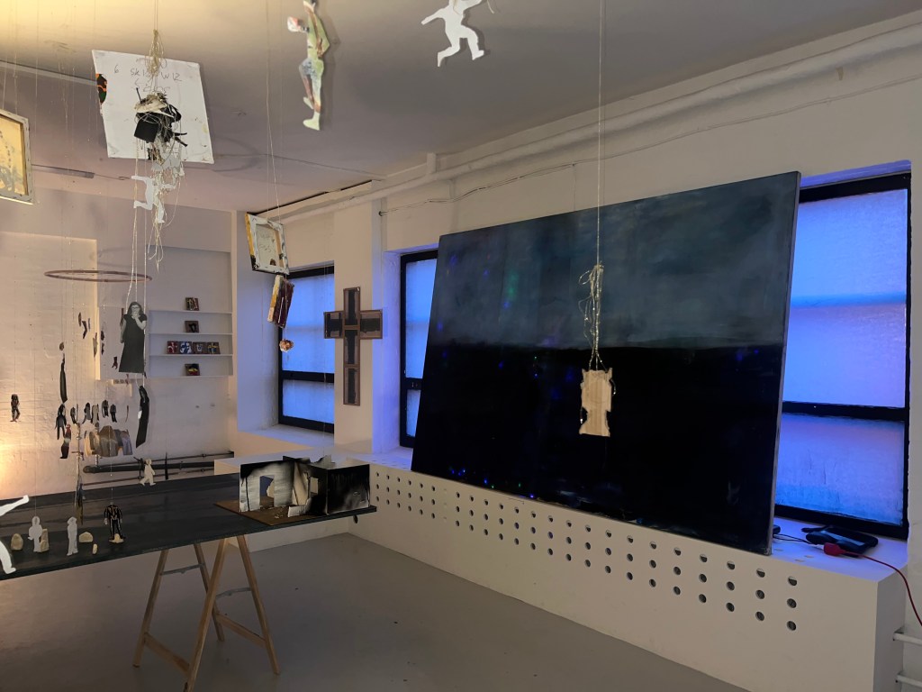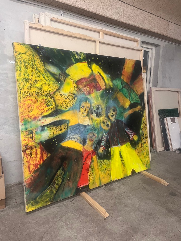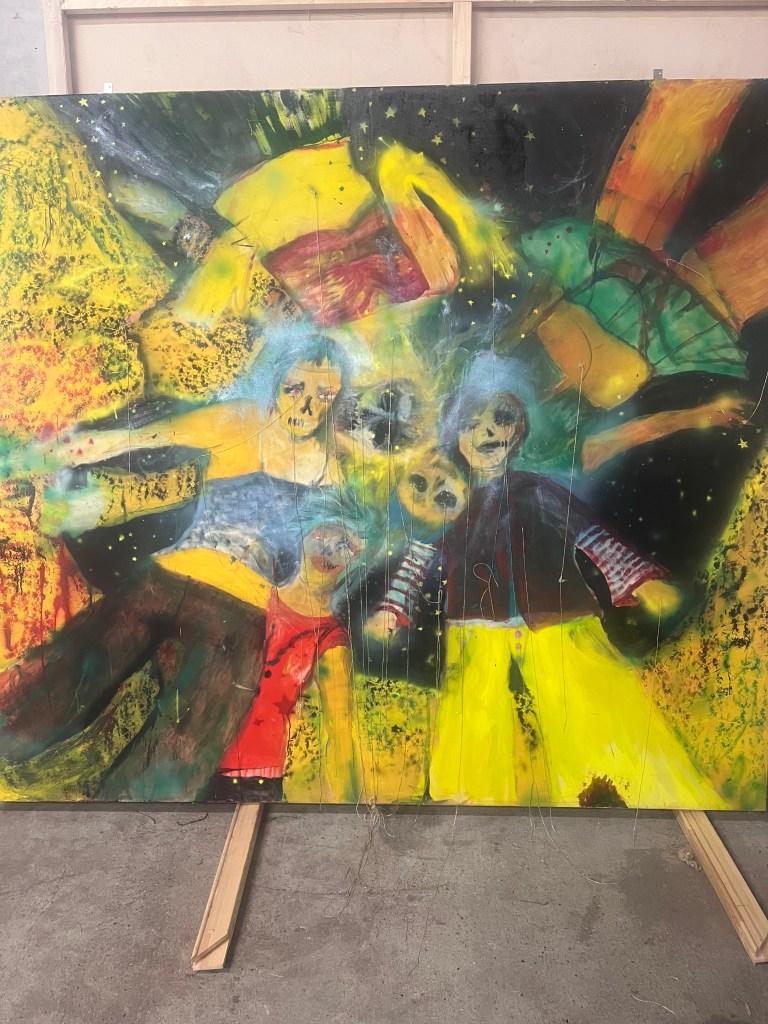 det er det her maleri som jeg malede på et tidspunkt hvor jeg ikke malede særlig meget fordi der skete alt muligt det virkelig liv som var mere hisset end hvad der kan ske på en flaget og så malede jeg de her figurer der står og kigger ned jeg tænkte på alle de gange hvor man sådan har slået sig og sådan har ligget og kigget sådan oppe i himlen og der er nogen der kigger ned på en og slå sig rigtig meget og så havde jeg haft det her maleri stående og blev ved med at tage det frem og male et lag og så så at det var enkelt og mærkeligt og til sidst så lignede det sådan work fantasy diskotek tror der kom for mange ingredienser i suppen og så har jeg bare haft det stående i flere år og Cringe så hårdt hver gang jeg har kigget på det men så skulle jeg lave det her forløb i Svendborg med den her kunstskole Fluch hvor at vi havde aftalt at jeg skulle lave en maleriudStilling og så involvere eleverne i processen og så endte vi med at lave i rummet sådan en stor korsformet spilleplade hvor de byggede sådan en infrastruktur med tankstation og terrorangreb og kult og kirkegård og pladeselskab og sådan en elev der gik amok og sådan noget og sådan nogle underlige malerier på pap med Jesus der var korsfæstet på alle mulige forskellige flag …
