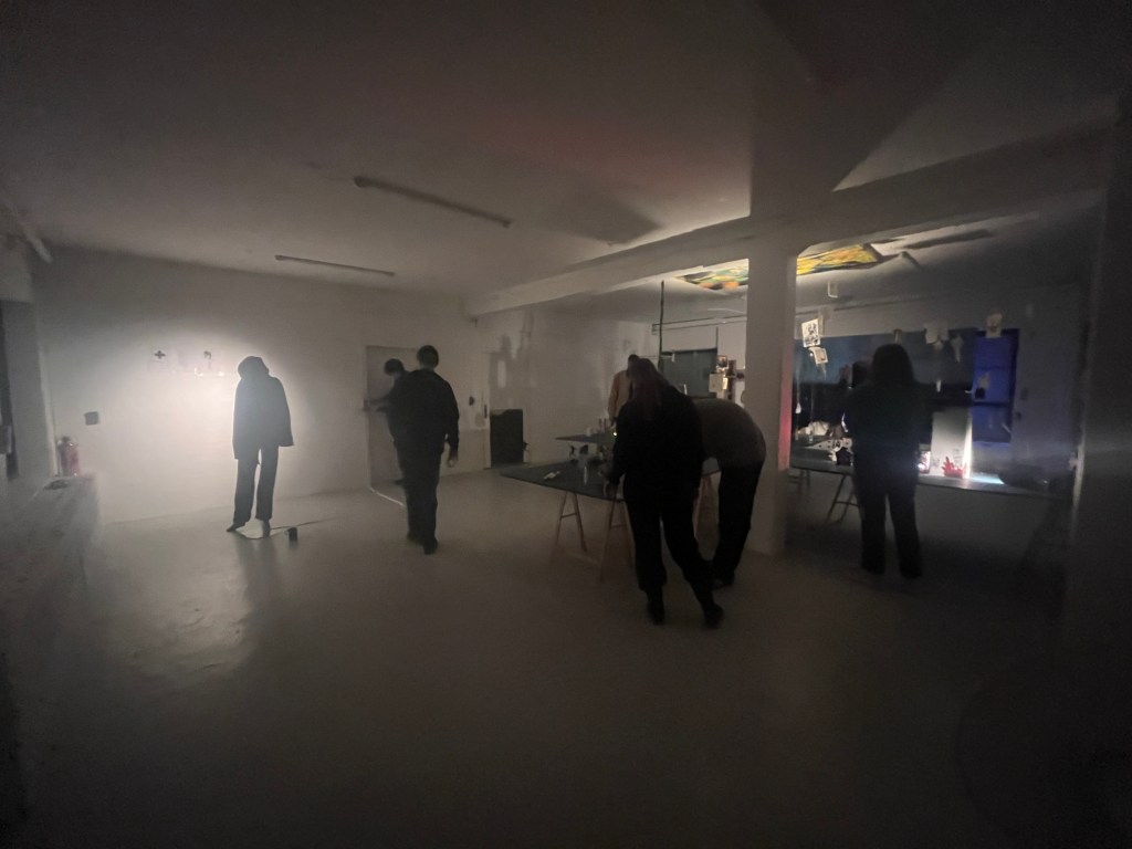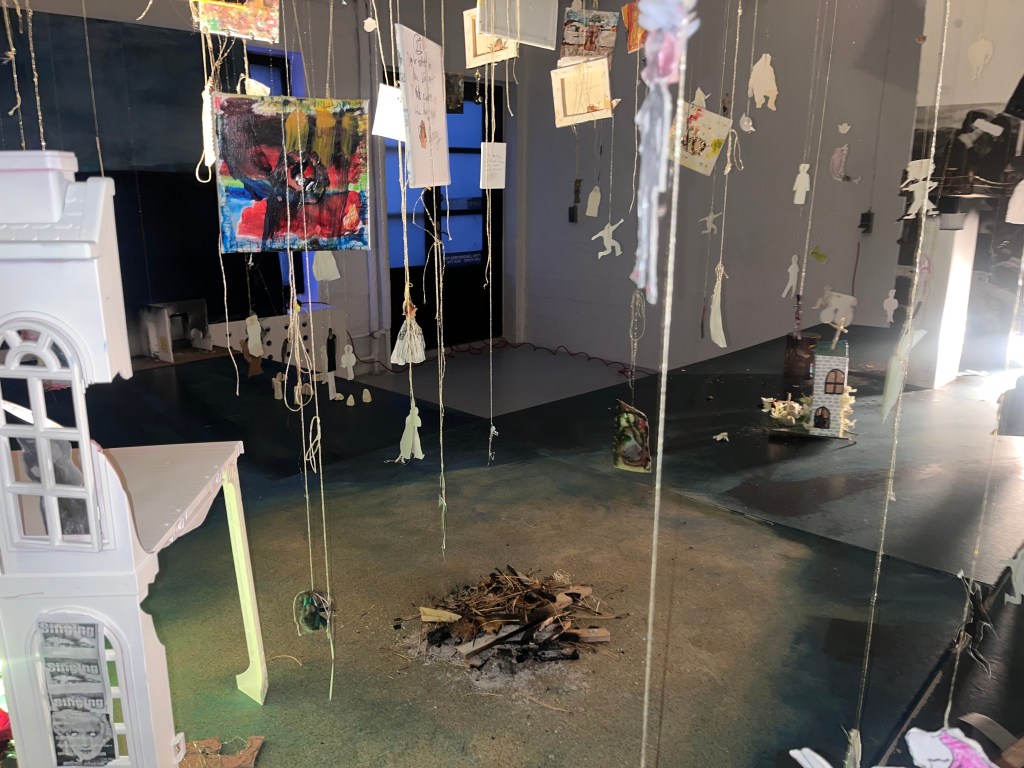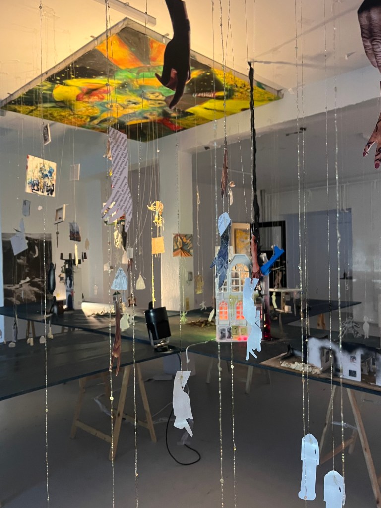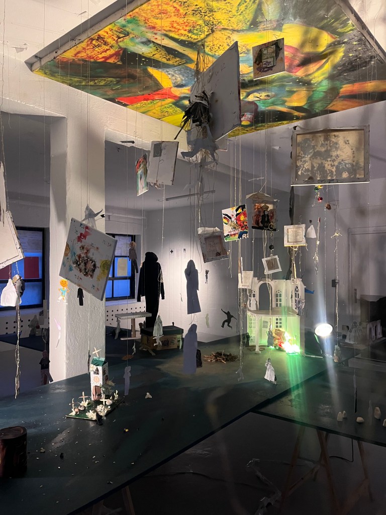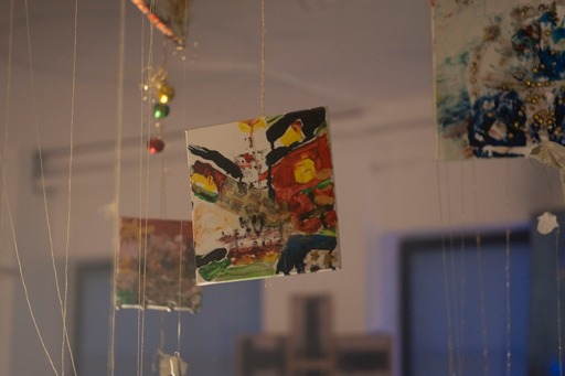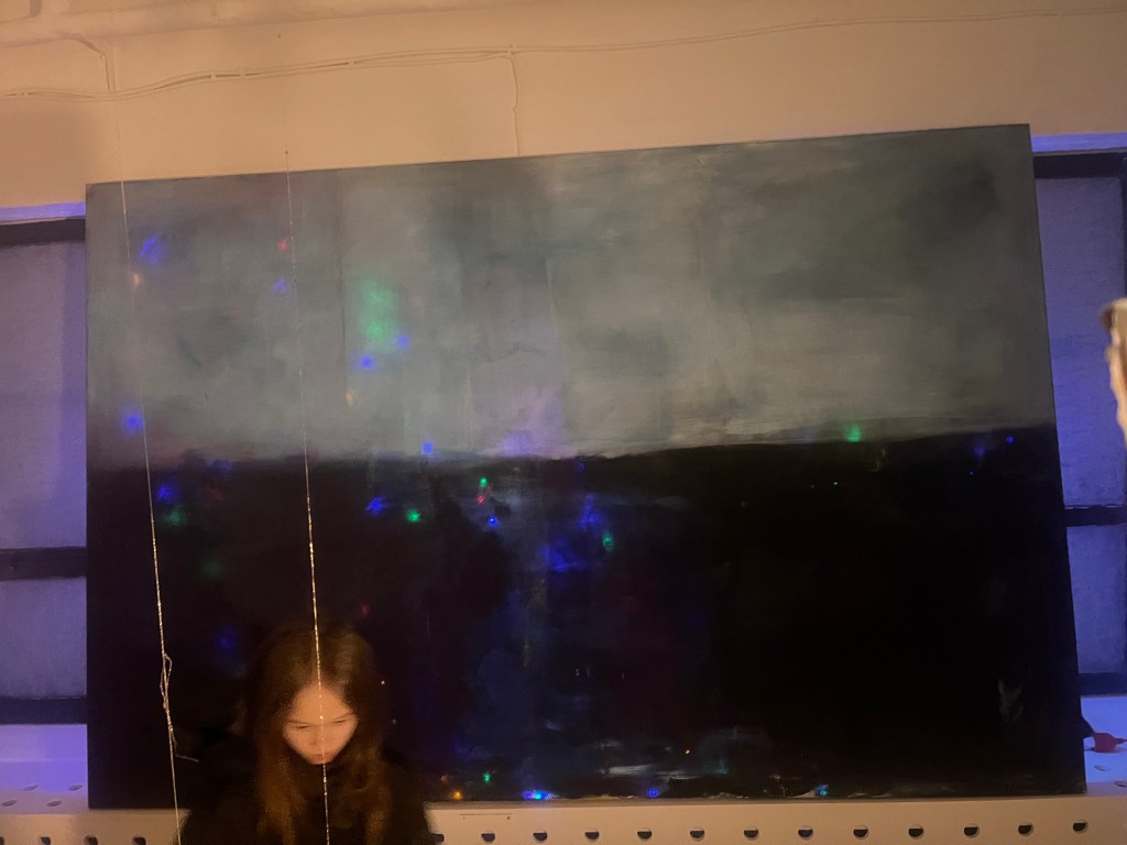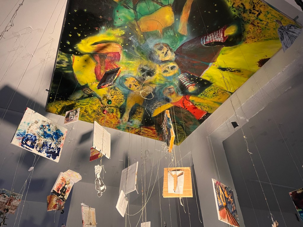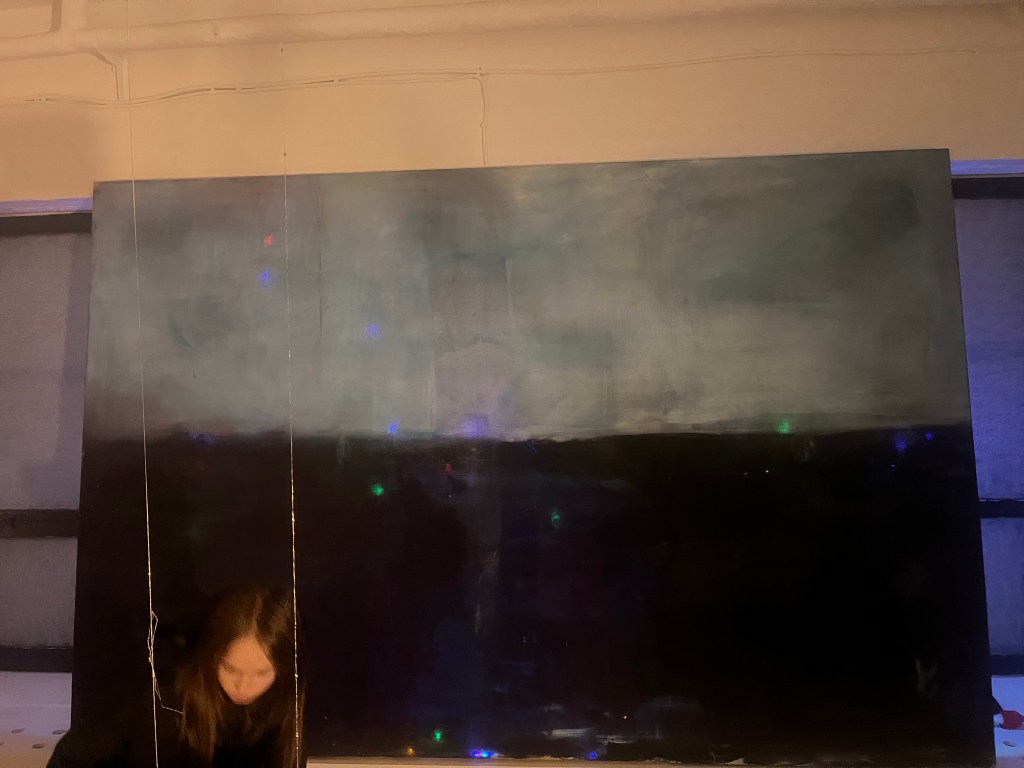 og så har mig og daisy et sindssygt julelys gardin tæppe som vi spændte fast bagpå . og så maleriet i loftet med guldtræde syet ind i øjne og munde og hænder på trippers . jeg kan på en måde slet ikke lide de her malerier , mit hjerte viber modsat men alligevel fik jeg det som om med installationen at det kom til at tænke selv , kunstmaskinen ….. og jeg er jo virkelig i det med kunst for åndsmaskinen . og føler det lykkes helt sygt når de 22 årige sidder rundt bålet og ryger smøger og snakker om epigenetik og fælles drømme arkitektur . sådan : make people trip cuz then they talk 😀 ej rune jeg et så mættet af det hele det er lidt svært at snakke køligt om , men uanset , uanset alting vil jeg gerne mødes i mit atelier eller snakke mere om kunst , sættter virnelig pris på dig og dine øjne.
