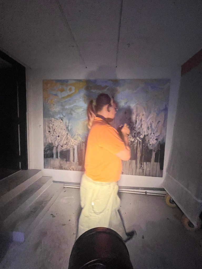 . og så få dem afvist lol på månen !! malerierne får sådan nogle mærkelige skæbner , har fundet ud af det er det jeg elsker ved at male udover self selve det at male (det lidt mekaniske og blande ting og få ting til at fæstnes med hånden , luksus) er at følge deres skæbner rundt i soveværelser og kældre og mine forældre der har et kæmpe guldmaleri inde i deres stue og sender mig billeder når lyset er på en eller anden måde og køre til horsens og snakke med en blomstermaleri pusher SÅ fucking nuttet man deler det der rørte space , betagede space , og alle der elsker det og dyrker det har det som en lille bly business at det hele er ånd og hjerte og hemligheder loll. udenfor institutionen …. tilbage til de intime svagt belyste rum med malerierne!!!! lissom med musik