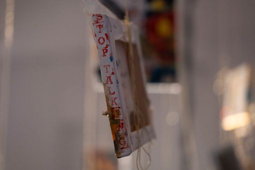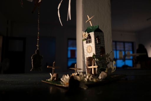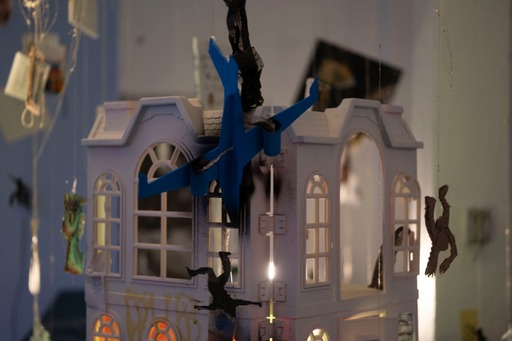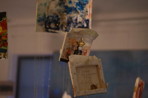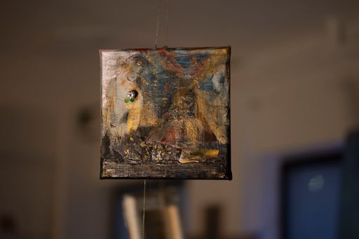 men der havde inkluderet et maleri som var med på den frie til en anden surrealisme som var det her rester agtige flag med de tre linjer og så havde jeg lagt billedet ned så det var horisontalt og så blev jeg træt af at se på de der rare farver fanget inde i sådan det tyske træ delte flag og så malede jeg sådan et horisontalt landskab og så med sådan noget glimmer og alle mulige blå panter men bare to fadder horisontalt ligesom hav og hæmmede og så havde det også stadig i mit atelier i mega lang tid og jeg havde ikke vidst hvad jeg skulle gøre med det men så kom det med som sådan en horisont for vores korbordplade og infrastrukturen og så installerede vi en stor lyskædegardin som hang ligesom tæppet fast til bagsædet af maleriet så det står og blinkede i sådan nogle former over denne her horisontlinje og så maleriet med figurerne der kigger ned på den der er faldet det kommer op at hænge i loftet og så syede jeg guldår i øjnene og munden og navlerne og rundt omkring på kroppen og så hang den her maleris jeg lavede sidste år sikke Inside the superstar den hang ned fra guldur hvor de små malerier de flygter ud af Dais dukkehus som stod på midten af pladen hvor der var sådan et stort hul why halv benzin ned i og så havde vi sådan tændt ild til dagen før lade sådan bål på midten af pladen fordi vi endte med at lave bål hele tiden på den der kunstskole hver gang jeg var der så lavede vi bål og så kom udstillingen til at hedde miste kjole og så var det sådan sådan der men jeg følte bare det var så luksus og tage et maleri jeg ikke helt forstår hvad kan og så bare tvinge dig til at have en mere sådan formel funktion og at de små malerier som er i en helt anden skala et helt andet univers få lov at hænge som uro ned og på en måde være tekst for billedet de hænger i de små malerier malede jer sidste vinter hvor at jeg var gået i stå med de store malerier og havde for mange ideer og tænke for mange tanker til at kunne handle på noget ligesom blokeret der lavede jeg sådan et ritual tre dage i mit køkken center hvor at jeg bare trippede fuldstændig ud på keta og prøvet at male alle de drømme jeg ikke kunne stoppe med at tænke på og alle de beskeder jeg ikke kunne stoppe med at tænke på og hvis jeg kunne så vil jeg lave en kæmpe kæmpe maleri udstilling med dem alle sammen alle 22 som store fordi de har altid været bare skitser til monumentale billeder fordi jeg vil helst kun male store malerier jeg tror ikke på de små formater i hvert fald ikke til hvad jeg skal bruge det til og jeg ved det ikke så synes jeg også at de bare beskriver en tilstand på en ret særlig måde for der skete et eller andet helt vildt i sådan alle mennesker omkring mig liv det var som om alle skulle igennem sådan en tornado og jeg oplevede af prøver at udstille det at folk læse det er ret tidligt hvad for et greb det var og der kom en eller anden gammel fyr til min artist talk som havde gået på det fynske og Malmø sådan ti år inden mig hvor vi snakkede om det der med at det er fantasifuld og mystiske var forbudt i så lang tid og at det endelig har fået en plads hvor læsningen ikke er forstyrret af konceptuelt lyst og sådan reed tænkning og også at det ikke er en trojansk hest der er så meget kontemporær kunst der bare er en trojansk hest