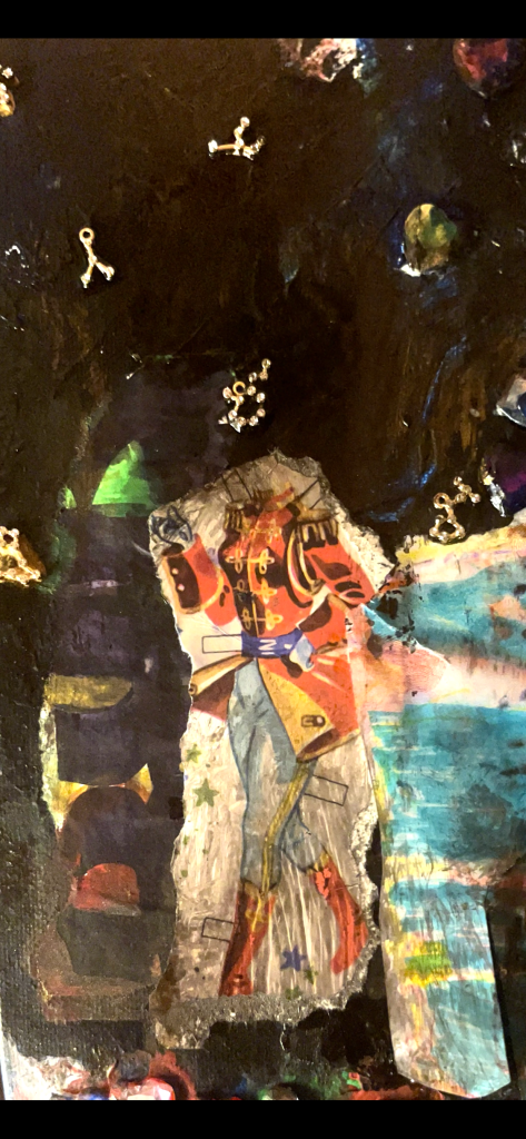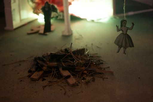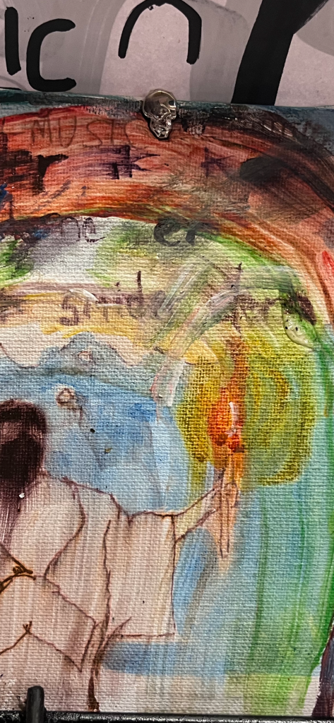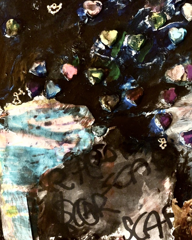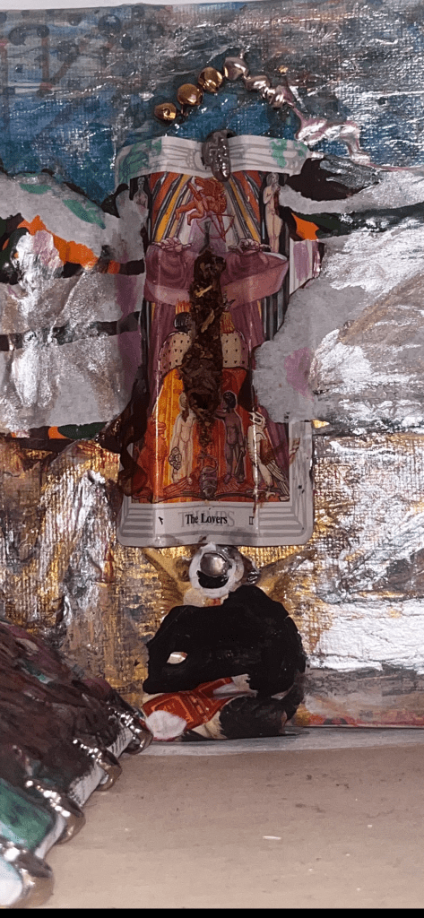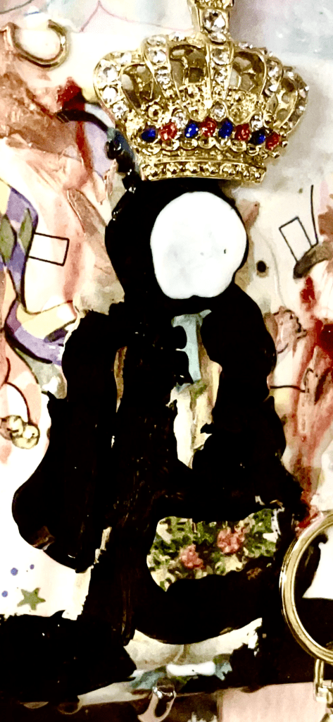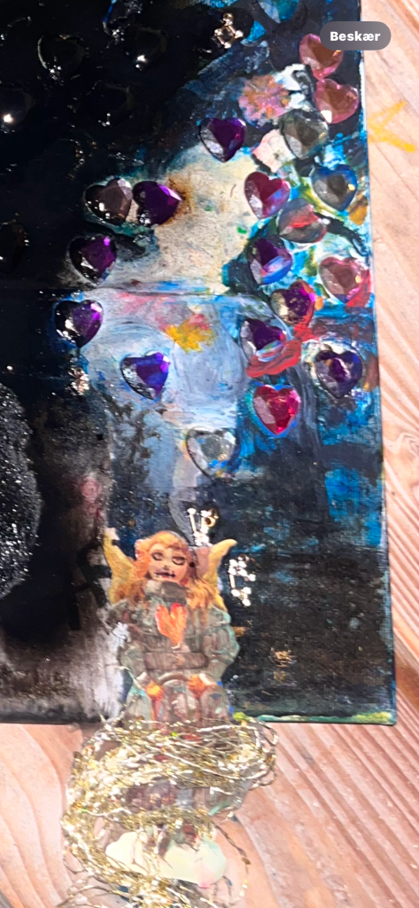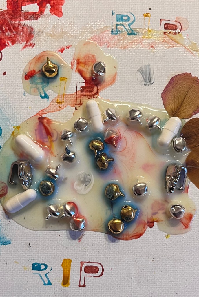 paper, acrylics, watercolor, leatherdye, tinted glue, pen, pencil, ink, mixing trays, weed mix, antihestamines, straw, poppy seeds, poppy cap, dried leaves, ashes, simili-hearts, white rabbit candy wrapper, drawings, dress-up dolls and scrap-images from workers museum copenhagen, keychain from round tower copenhagen, 8-ball keychain from dollarstore, silver skulls, bells, gold, blood, fake blood, gift wrapping, iron-on crossbone heart, diamond ear ring, gold thread, Mugler – Angel, Etat Libre D’Orange – Exit the king, Amber oil on canvas