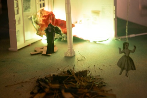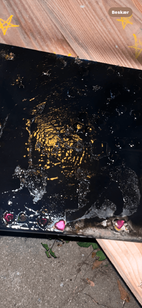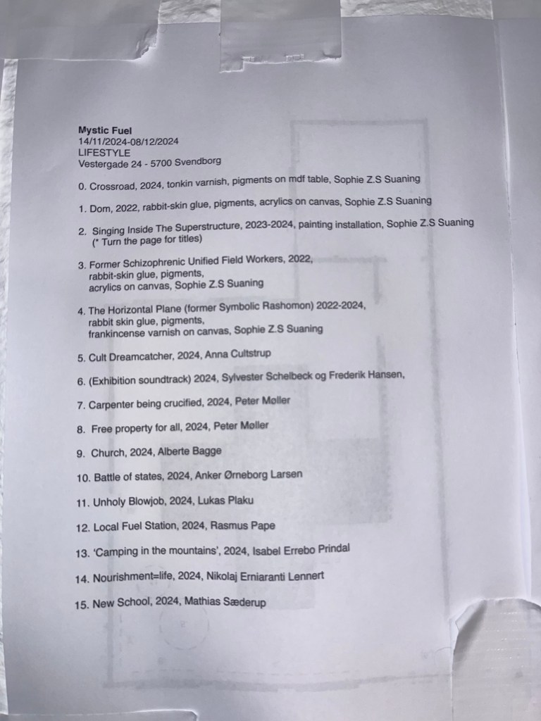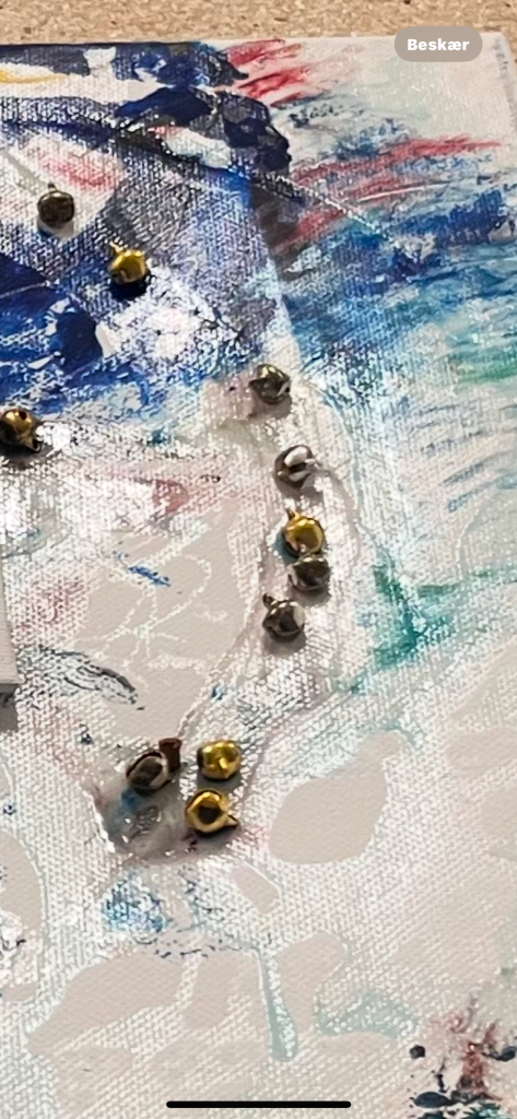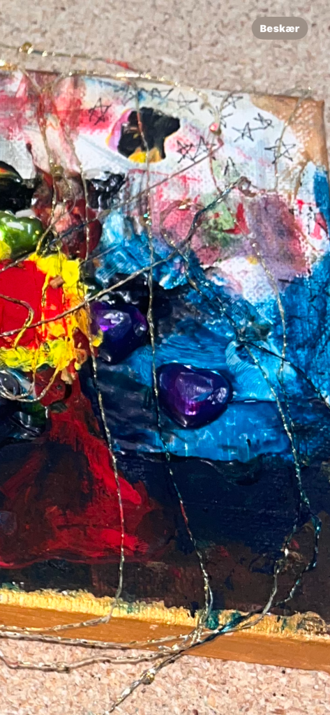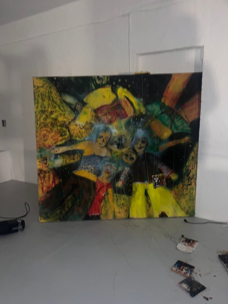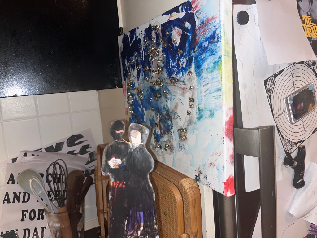 paper, acrylics, watercolor, leatherdye, tinted glue, pen, pencil, ink, mixing trays, weed mix, antihestamines, straw, poppy seeds, poppy cap, dried leaves, ashes, simili-hearts, white rabbit candy wrapper, drawings, dress-up dolls and scrap-images from workers museum copenhagen, keychain from round tower copenhagen, 8-ball keychain from dollarstore, silver skulls, bells, gold, blood, fake blood, gift wrapping, iron-on crossbone heart, diamond ear ring, gold thread, Mugler – Angel, Etat Libre D’Orange – Exit the king, Amber oil on canvas